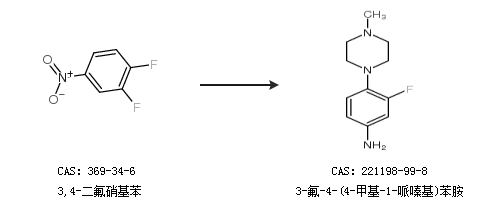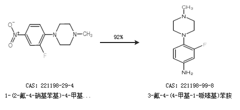 1.通过1-(2-氟-4-硝基苯基)-4-甲基哌嗪合成3-氟-4-(4-甲基-1-哌嗪基)苯胺,收率约92%;