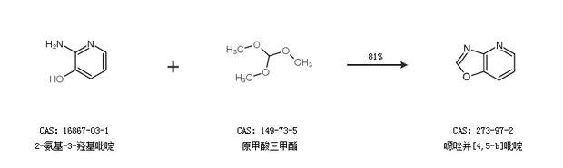 2.通过2-氨基-3-羟基吡啶和原甲酸三甲酯合成噁唑并[4,5-b]吡啶,收率约81%;