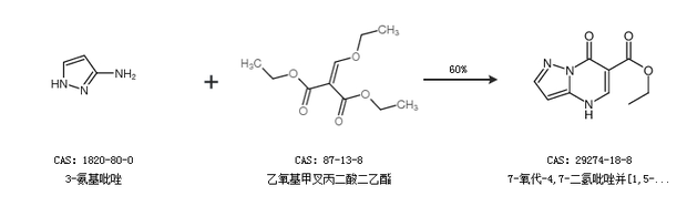 2.通过3-氨基吡唑和乙氧基甲叉丙二酸二乙酯合成7-氧代-4,7-二氢吡唑并[1,5-a]嘧啶-6-羧酸乙酯,收率约60%;