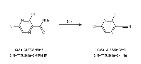 1.通过3,5-二氯吡嗪-2-羧酰胺合成3,5-二氯吡嗪-2-甲腈,收率约64%;