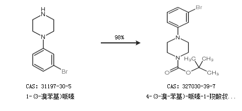 1.通过1-(3-溴苯基)哌嗪合成4-(3-溴-苯基)-哌嗪-1-羧酸叔丁酯,收率约98%;