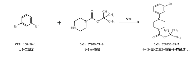 2.通过1,3-二溴苯和1-Boc-哌嗪合成4-(3-溴-苯基)-哌嗪-1-羧酸叔丁酯,收率约50%;
