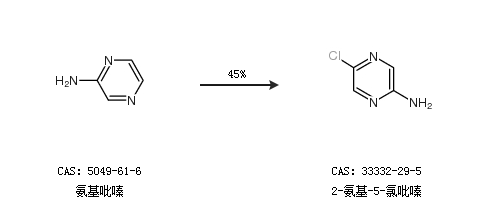 1.通过氨基吡嗪合成2-氨基-5-氯吡嗪,收率约45%;