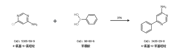 1.通过4-氨基-6-氯嘧啶和苯硼酸合成4-氨基-6-苯基嘧啶,收率约37%;
