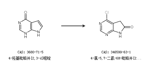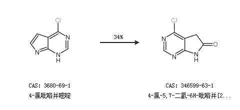 1.通过4-氯吡咯并嘧啶合成4-氯-5,7-二氢-6H-吡咯并[2,3-D]嘧啶-6-酮,收率约34%;