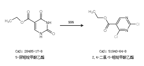 1.通过5-尿嘧啶甲酸乙酯合成2,4-二氯-5-嘧啶甲酸乙酯,收率约99%;