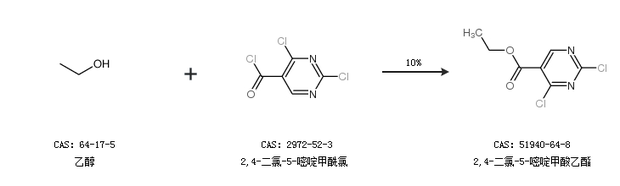 2.通过乙醇和2,4-二氯-5-嘧啶甲酰氯合成2,4-二氯-5-嘧啶甲酸乙酯,收率约10%;