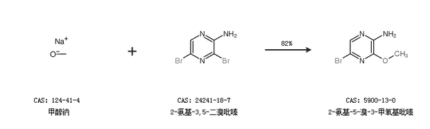 1.通过甲醇钠和2-氨基-3,5-二溴吡嗪合成2-氨基-5-溴-3-甲氧基吡嗪,收率约82%;