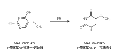 1.通过5-甲氧基-2-巯基-4-嘧啶醇合成5-甲氧基-2,4-二羟基嘧啶,收率约95%;