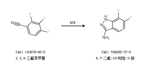 1.通过2,3,4-三氟苯甲腈合成6,7-二氟-1H-吲唑-3-胺,收率约42%;