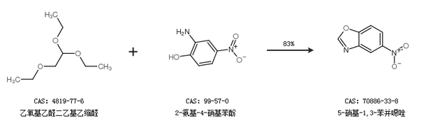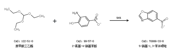 2.通过原甲酸三乙酯和2-氨基-4-硝基苯酚合成5-硝基-1,3-苯并噁唑,收率约94%;