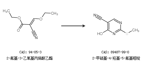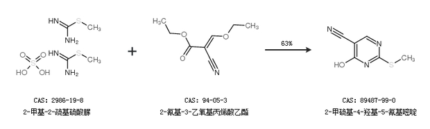 1.通过2-甲基-2-疏基硫酸脲和2-氰基-3-乙氧基丙烯酸乙酯合成2-甲硫基-4-羟基-5-氰基嘧啶,收率约63%;