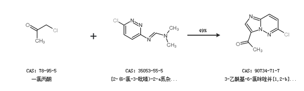 1.通过一氯丙酮和[2-(6-氯-3-吡嗪)-2-a氮杂乙烯基]二甲基胺合成3-乙酰基-6-氯咪唑并[1,2-b]哒嗪,收率约49%;