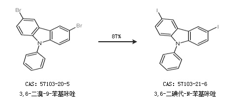 2.通过3,6-二溴-9-苯基咔唑合成3,6-二碘代-N-苯基咔唑,收率约87%;