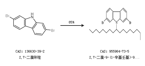 1.通过2,7-二溴咔唑合成2,7-二溴-9-(1-辛基壬基)-9H-咔唑,收率约85%;