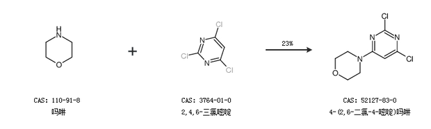 2.通过吗啉和2,4,6-三氯嘧啶合成4-(2,6-二氯-4-嘧啶)吗啉,收率约23%;