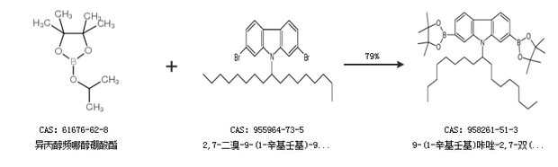 1.通过异丙醇频哪醇硼酸酯和2,7-二溴-9-(1-辛基壬基)-9H-咔唑合成9-(1-辛基壬基)咔唑-2,7-双(硼酸频哪醇酯),收率约79%;