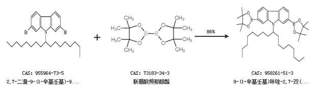2.通过2,7-二溴-9-(1-辛基壬基)-9H-咔唑和联硼酸频那醇酯合成9-(1-辛基壬基)咔唑-2,7-双(硼酸频哪醇酯),收率约86%;