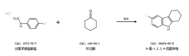 1.通过对氯苯肼盐酸盐和环己酮合成6-氯-1,2,3,4-四氢咔唑,收率约92%;
