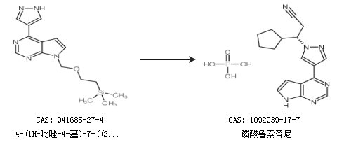 2.通过4-(1H-吡唑-4-基)-7-((2-(三甲基甲硅烷基)乙氧基)-甲基)-7h-吡咯并[2,3-d]嘧啶合成磷酸鲁索替尼