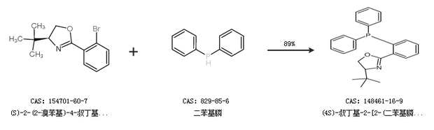 1.通过(S)-2-(2-溴苯基)-4-叔丁基-4,5-二氢噁唑和二苯基膦合成(4S)-叔丁基-2-[2-(二苯基膦基)苯基]-4,5-二氢噁唑,收率约89%;