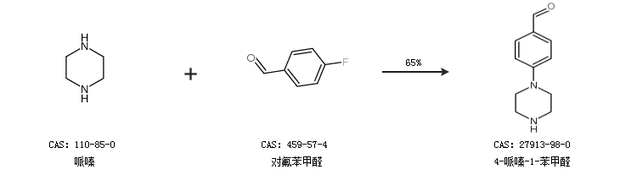 1.通过哌嗪和对氟苯甲醛合成4-哌嗪-1-苯甲醛,收率约65%;