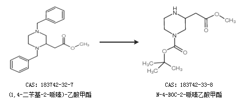 2.通过(1,4-二苄基-2-哌嗪)-乙酸甲酯合成N-4-BOC-2-哌嗪乙酸甲酯
