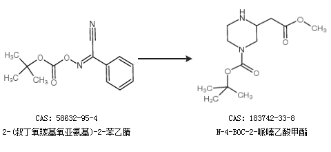 1.通过2-(叔丁氧羰基氧亚氨基)-2-苯乙腈合成N-4-BOC-2-哌嗪乙酸甲酯