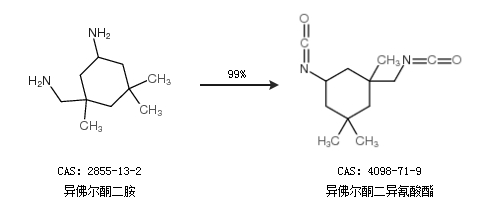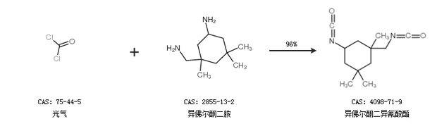 1.通过光气和异佛尔酮二胺合成异佛尔酮二异氰酸酯,收率约96%;