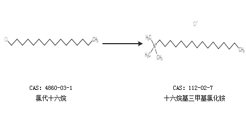2.在以硅胶为载体的CuO/Cr2O3系催化剂的催化下,十六烷醇与二甲胺于一定温度和压力下合成十六烷基二甲基叔胺。再以氢氧钠为催化剂与一氯甲烷反应制得氯化十六烷基三甲基铵。