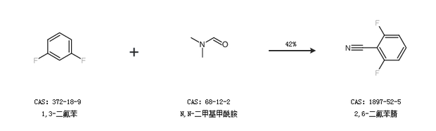 2.通过1,3-二氟苯和N,N-二甲基甲酰胺合成2,6-二氟苯腈,收率约42%;