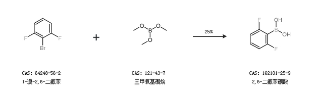 2.通过1-溴-2,6-二氟苯和三甲氧基硼烷合成2,6-二氟苯硼酸,收率约25%;