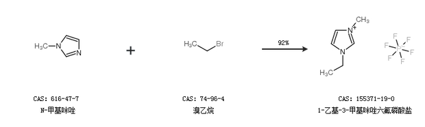 1.通过N-甲基咪唑和溴乙烷合成1-乙基-3-甲基咪唑六氟磷酸盐,收率约92%;