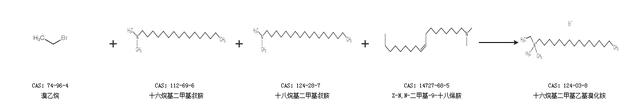1.通过溴乙烷、十六烷基二甲基叔胺、十八烷基二甲基叔胺和Z-N,N-二甲基-9-十八烯胺合成十六烷基二甲基乙基溴化铵