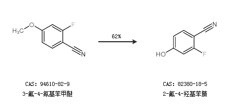 1.通过3-氟-4-氰基苯甲醚合成2-氟-4-羟基苯腈,收率约62%;