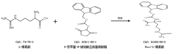 1.通过L-精氨酸和9-芴甲基-N-琥珀酰亚胺基碳酸酯合成Fmoc-L-精氨酸,收率约55%;