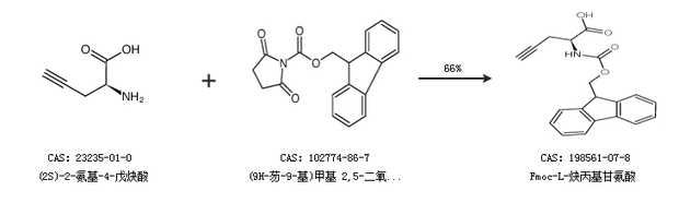 1.通过(2S)-2-氨基-4-戊炔酸和(9H-芴-9-基)甲基 2,5-二氧代吡咯烷-1-羧酸合成Fmoc-L-炔丙基甘氨酸,收率约66%;