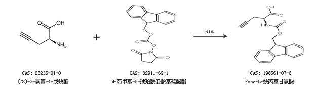 2.通过(2S)-2-氨基-4-戊炔酸和9-芴甲基-N-琥珀酰亚胺基碳酸酯合成Fmoc-L-炔丙基甘氨酸,收率约61%;