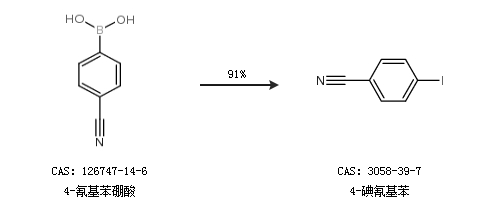 2.通过4-氰基苯硼酸合成4-碘氰基苯,收率约91%;