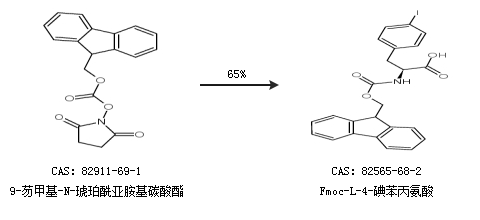 1.通过9-芴甲基-N-琥珀酰亚胺基碳酸酯合成Fmoc-L-4-碘苯丙氨酸,收率约65%;