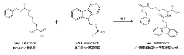 1.通过N6-Cbz-L-赖氨酸和氯甲酸-9-芴基甲酯合成N''-芴甲氧羰基-N-苄氧羰基-L-赖氨酸,收率约91%;