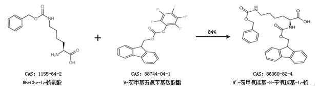 2.通过N6-Cbz-L-赖氨酸和9-芴甲基五氟苯基碳酸酯合成N''-芴甲氧羰基-N-苄氧羰基-L-赖氨酸,收率约84%;