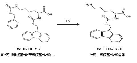 2.通过N''-芴甲氧羰基-N-苄氧羰基-L-赖氨酸合成N-芴甲氧羰基-L-赖氨酸,收率约88%;