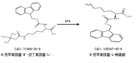 1.通过N-芴甲氧羰基-N''-叔丁氧羰基-L-赖氨酸合成N-芴甲氧羰基-L-赖氨酸,收率约97%;