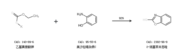 2.通过乙基黄原酸钾和美沙拉嗪杂质C合成2-巯基苯并恶唑,收率约92%;