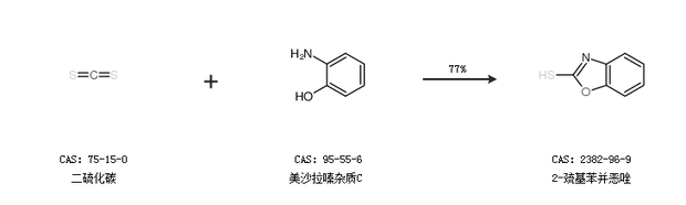 1.通过二硫化碳和美沙拉嗪杂质C合成2-巯基苯并恶唑,收率约77%;
