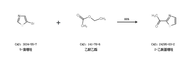 1.通过5-溴噻唑和乙酸乙酯合成2-乙酰基噻唑,收率约88%;