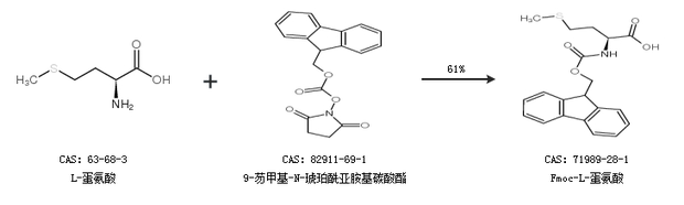 2.通过L-蛋氨酸和9-芴甲基-N-琥珀酰亚胺基碳酸酯合成Fmoc-L-蛋氨酸,收率约61%;
