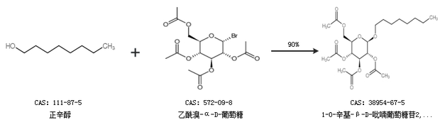 1.通过正辛醇和乙酰溴-α-D-葡萄糖合成1-O-辛基-β-D-吡喃葡萄糖苷2,3,4,6-四乙酸盐,收率约90%;