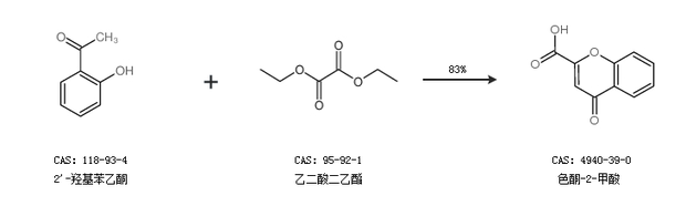 1.通过2''-羟基苯乙酮和乙二酸二乙酯合成色酮-2-甲酸,收率约83%;